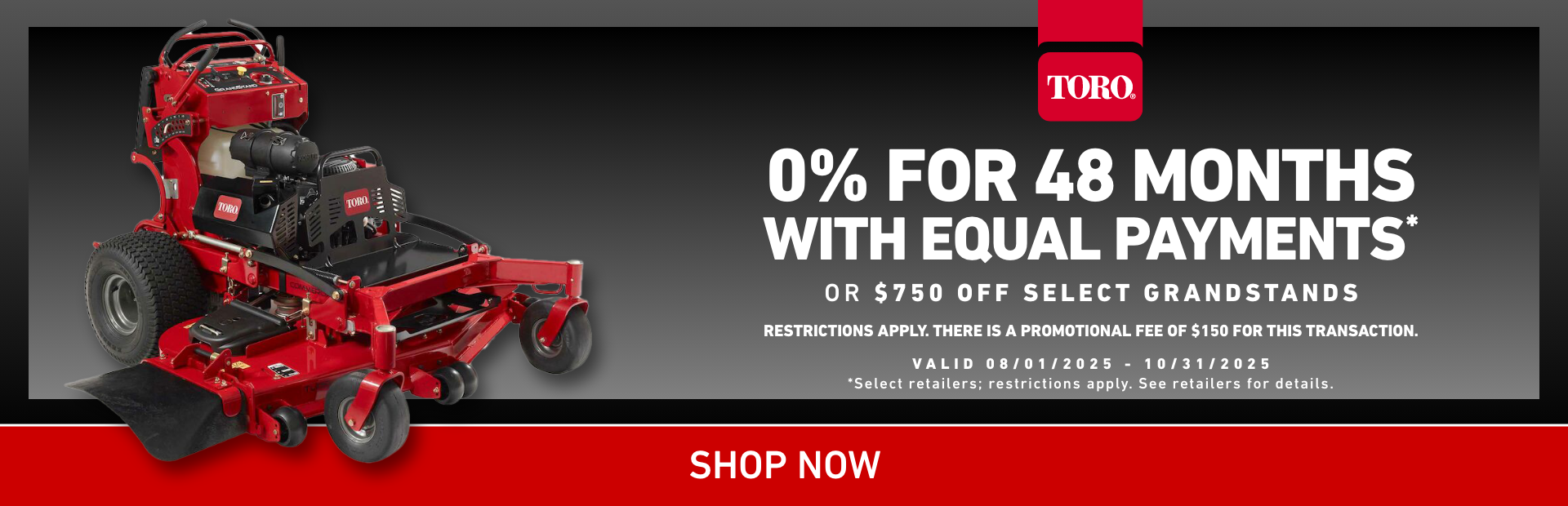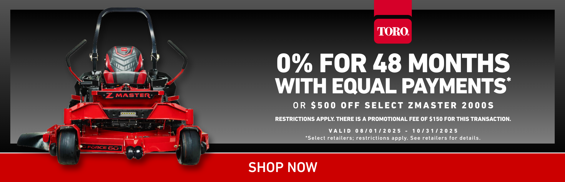 *Applies only to Financing Programs offered by Roadrunner Financial, Inc. All applicants to Roadrunner Financial, Inc, are subject to credit approval. Approval, rates, minimum purchase requirements and terms advertised are based upon the minimum credit bureau (FICO®) score indicated and overall creditworthiness. Your FICO® Credit Score, key factors and other credit information are based on data from Experian® and may be different from other credit scores and other credit information provided by different bureaus. Offer applies to a maximum of 2 units per applicant. Other qualifications and restrictions may apply. Minimum amount financed is $1,000. Maximum amount financed is $25,000. UCC filing fee may be charged. Offer not valid for mowers used for commercial purposes. Offer effective on eligible and qualified Toro Mowers purchased from a participating Toro Mower dealer. Offer valid in the U.S. only (excluding AK, HI & D.C.). Other financing offers are available. See your local dealer for details. Financing promotions void where prohibited. Offer subject to change without notice.